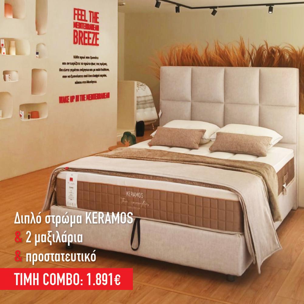 Το στρώμα KERAMOS είναι το νεότερο στρώμα της συλλογής Inventor. Η ισχυρή στήριξη προσφέρεται από το σύστημα πυκνών, υψηλών και ανεξάρτητων ελατηρίων Wake Up Refreshed Pocket Springs. Η άνεση εξασφαλίζεται από ίνες από κοκοφοίνικα, εξαιρετικής ποιότητας ακρυλικά, βαμβάκι και αφρώδη υλικά στο ενσωματωμένο ανώστρωμα για επιπλέον άνεση. Το ύφασμα αποτελείται από 100% βισκόζη με πιστοποίηση OEKO TEX STANDARD 100 και επεξεργασία Olive Oil Treatment για φροντίδα της επιδερμίδας και αντιβακτηριδιακή προστασία. Το στρώμα KERAMOS έχει ενσωματωμένο ανώστρωμα (Eurotop) με Body Comfort Foam που δημιουργεί μια αφράτη επιφάνεια για μεγαλύτερη άνεση. Τα υλικά τοποθετούνται με χειροποίητη διαδικασία που εξασφαλίζει τη συγκράτηση των φυσικών υλικών στο εσωτερικό του στρώματος, ώστε να παραμένουν στη σωστή θέση καθ’ όλη τη διάρκεια της χρήσης του, χωρίς να απαιτείται χρήση χημικών σκευασμάτων (π.χ. κόλλα).