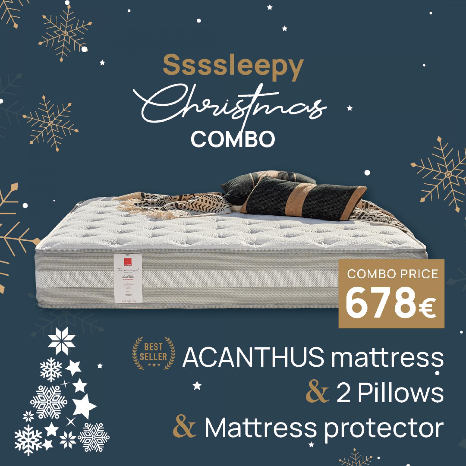 Combine the double anatomical ACANTHUS mattress (160x200cm) with two CURVED pillows and the TRIPLE FRESH mattress protector, and get them together at a bundle price of €678! Learn more.