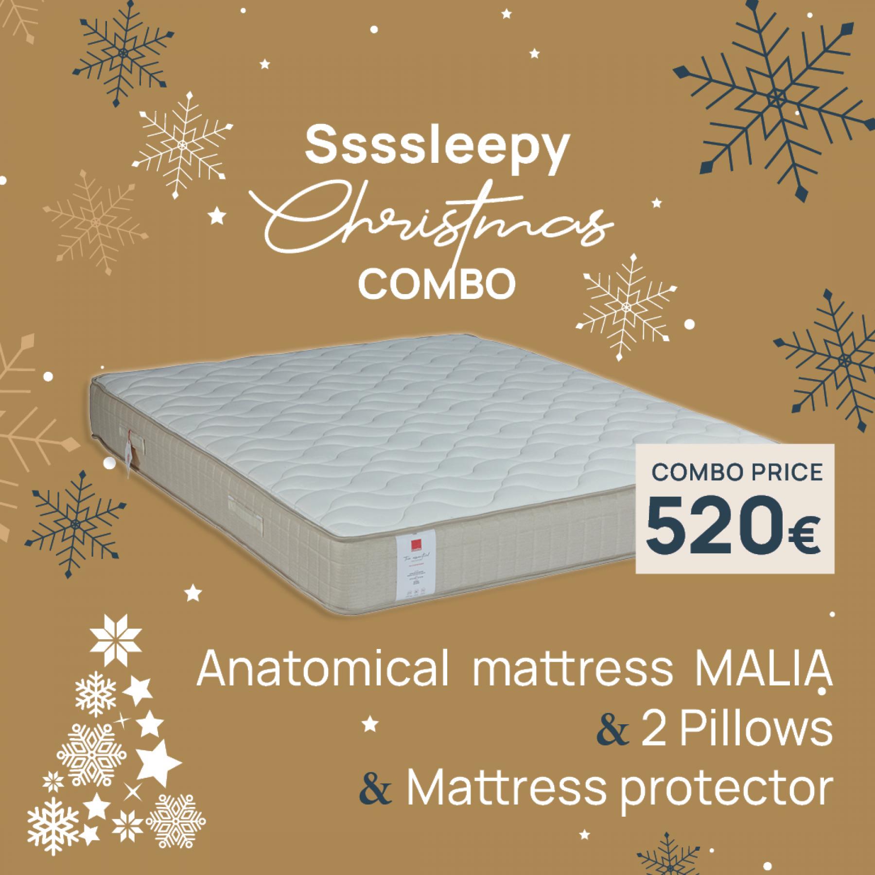 Combine the double anatomical MALIA mattress (160x200cm) with two CURVED pillows and the PROTECT mattress protector, and get them together at a bundle price of €520! Learn more.
